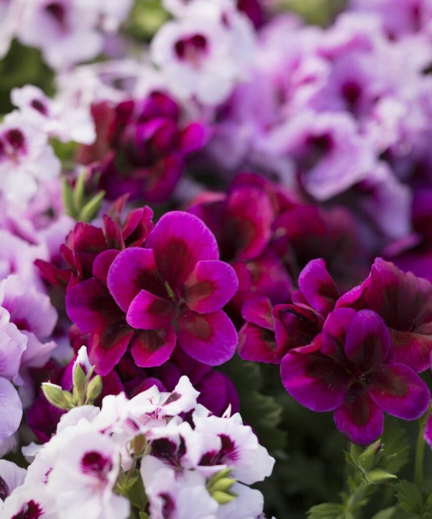 Neben stehenden und hängenden Geranien umfasst das Sortiment auch Edel-, Duft-, Schmetterlings-und Blattschmuckgeranien. Die Blüten zeigen sich schlicht oder üppig gefüllt und überraschen mit Formen von rund bis sternförmig – teils erinnern sie sogar an Rosen oder Tulpen. Auch das Laub ist ein echter Blickfang: mit unterschiedlichsten Grüntönen, Strukturen und Formen. Besonders Blattschmuckgeranien setzen mit ihren markanten Zeichnungen starke Akzente – selbst ohne Blüten.
